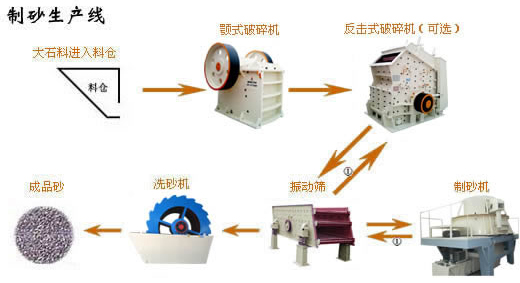 制砂生產(chǎn)線由振動(dòng)給料機(jī)、破碎機(jī)、制砂機(jī)(細(xì)碎機(jī))、洗砂機(jī)、振動(dòng)篩和膠帶傳輸機(jī)等設(shè)備組合而成。用戶可根據(jù)不同的工藝要求,來(lái)自行進(jìn)行組合,以滿足不同的工藝要求。